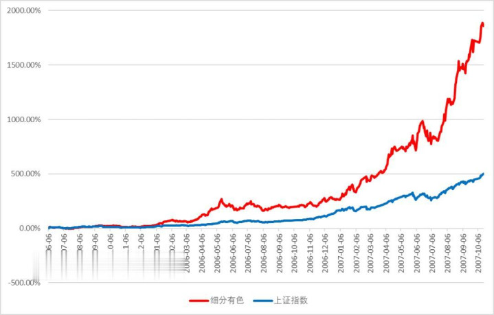 根据Wind统计,在2005年6月6日至2007年10月16日期间,上证指数在998点“触底”后,一路攀升至6124点。按收盘价计算,区间涨幅高达501.01%,而有色金属板块以1857.85%的涨幅高居各主要行业涨幅榜榜首。
