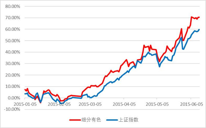 起于2014年7月的本轮牛市中,有色金属起初几乎被投资者所遗忘。截至2015年4月,沪指上涨117.90%,券商、计算机、钢铁、交通运输等板块涨幅均在150%以上,而有色金属板块仅上涨了91.64%,在申万28个一级行业涨幅中排名倒数第三。